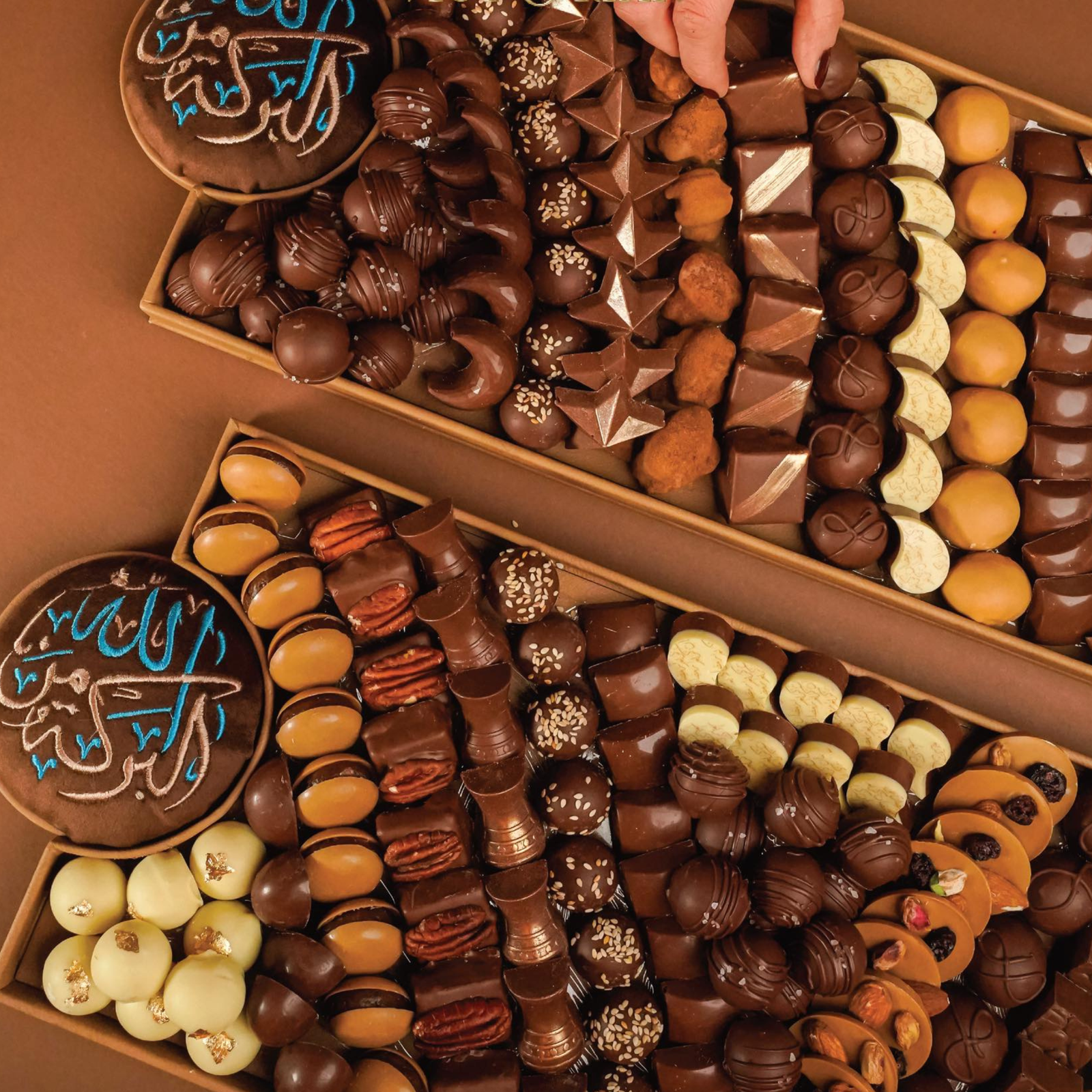 Inside, approximately 90 artisanal chocolate pieces are meticulously arranged, each crafted with distinctive fillings and varied textures, blending rich cocoa depth with refined sweetness.