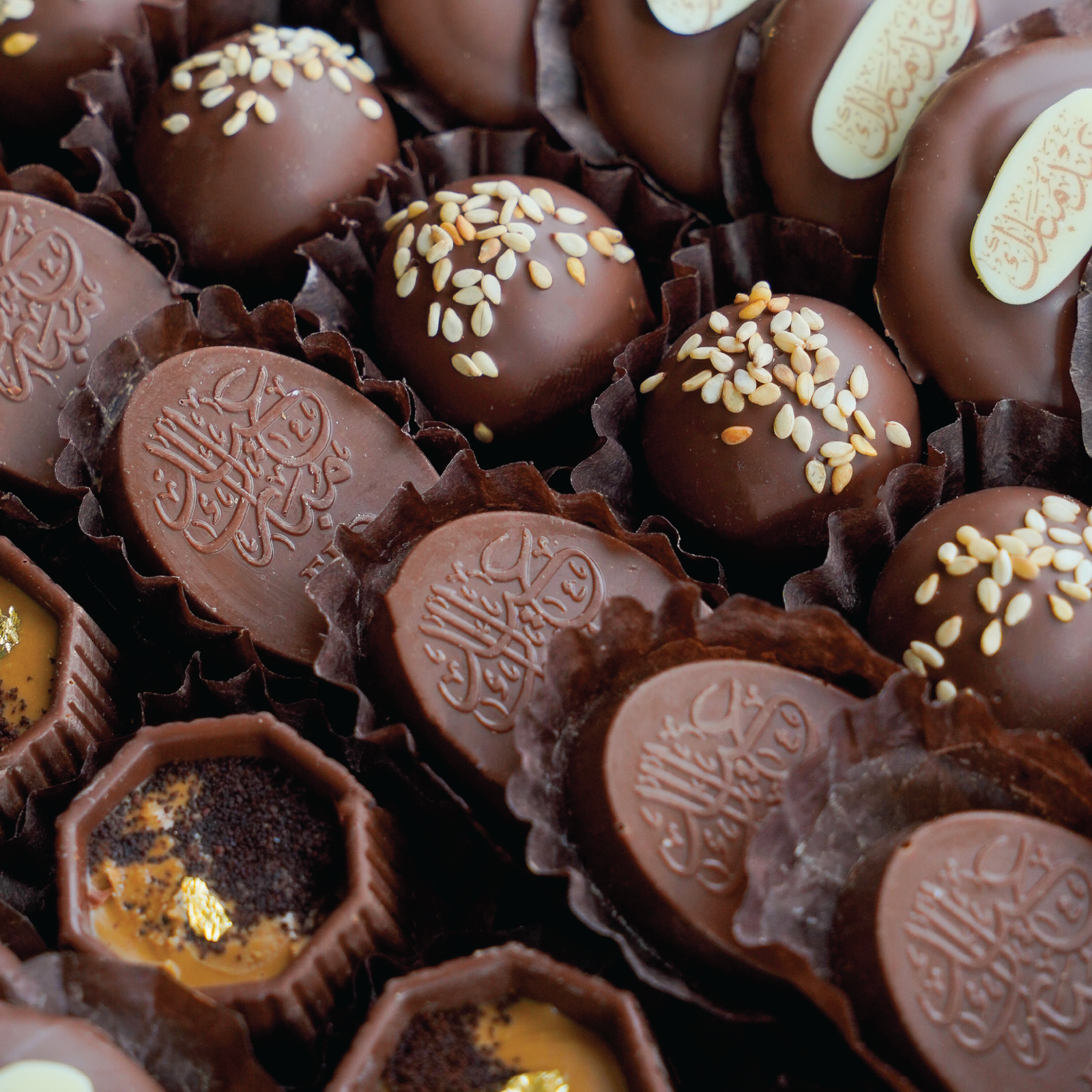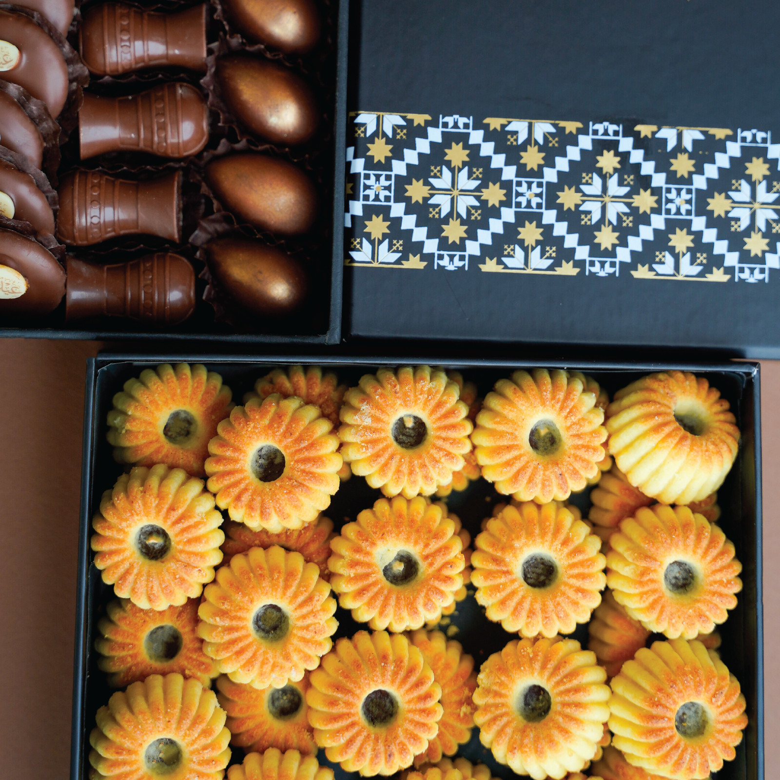 A luxurious Eid package featuring 60 pieces of premium assorted chocolates crafted with rich fillings including Arabic halva, salted caramel, tiramisu, pistachio, crunchy bites, and a variety of other signature flavors, paired with one box of premium date maamoul for a complete festive experience. Designed for elegant gifting and generous sharing during Eid.