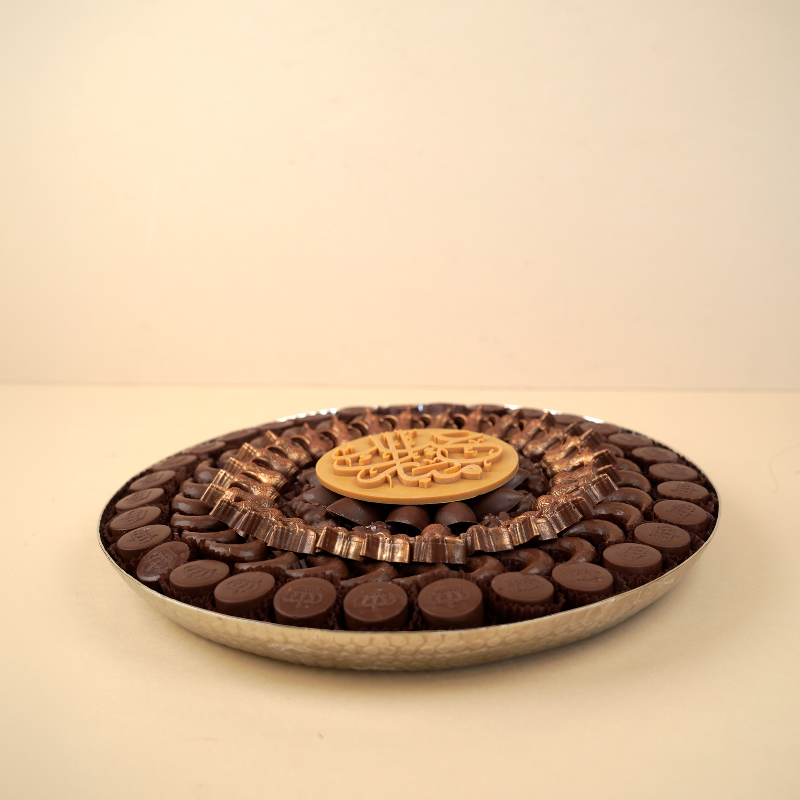 A luxurious round aluminum tray designed to elevate Eid al-Fitr hospitality with elegant presentation and rich variety. Filled with approximately 1400 grams of assorted artisan chocolates, this refined selection features festive Eid-inspired shapes and multiple premium fillings crafted to offer both visual beauty and a rich tasting experience.