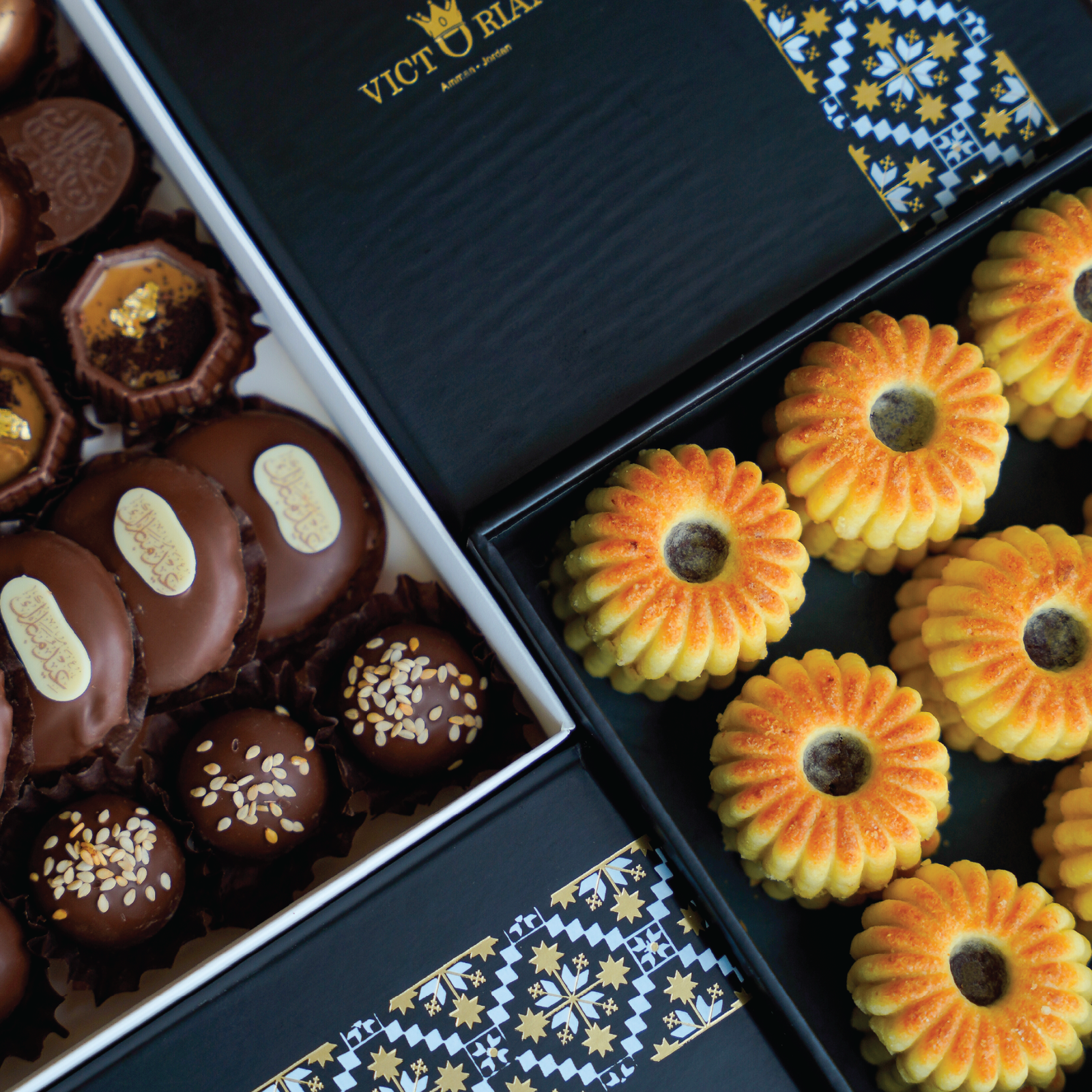 A refined Eid gift box featuring 31 pieces of assorted artisan chocolates with luxurious fillings including molasses & tahini, salted caramel, pistachio, and more, paired with one box of premium date maamoul. A perfect combination of rich flavors and festive elegance for sharing and gifting during Eid.