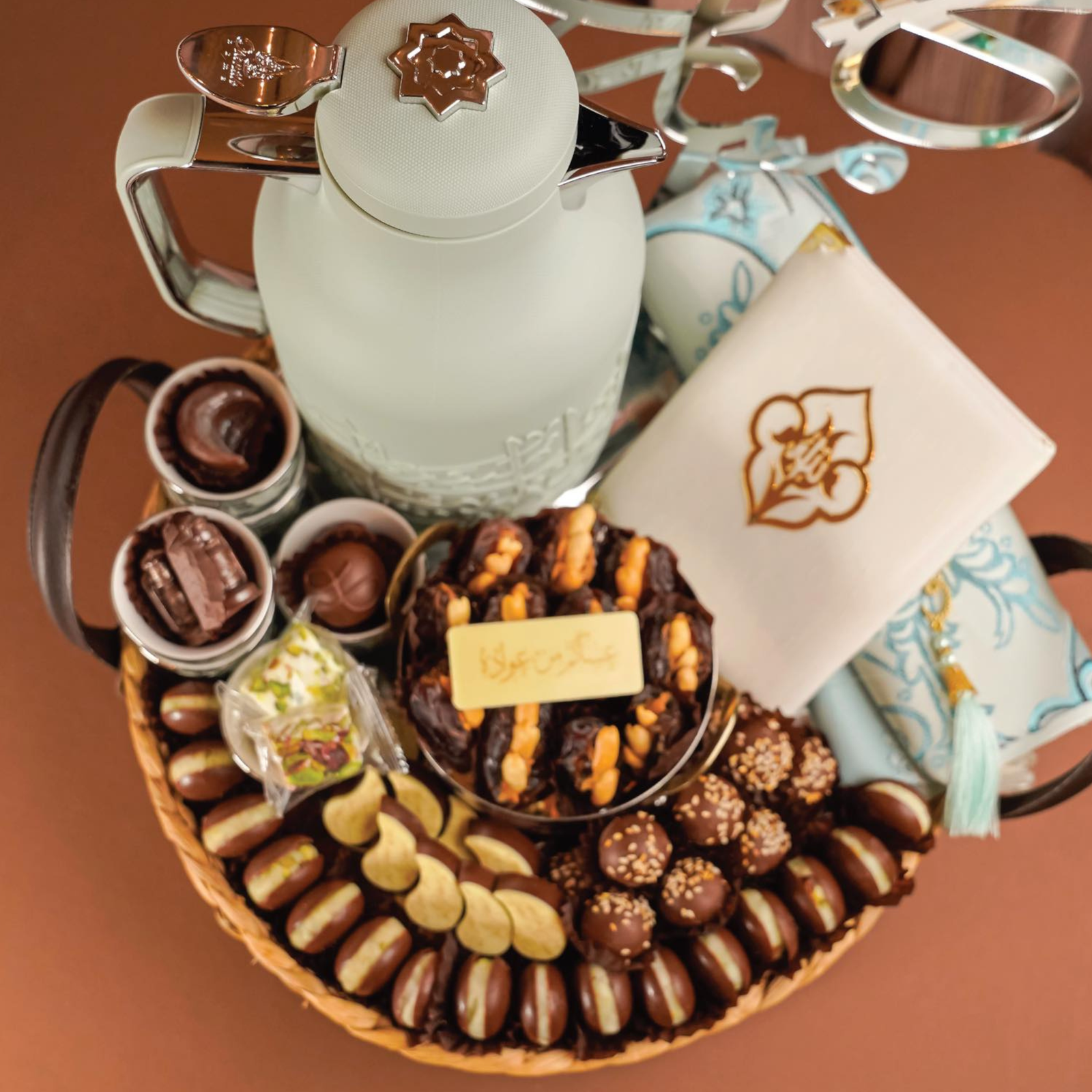 A thoughtfully curated bamboo gift basket designed for meaningful occasions, perfect for Ramadan and Mother’s Day. This elegant set features a selection of premium chocolates inspired by Ramadan flavors, stuffed dates, delicate nougat, and traditional sweets, complemented by a classic coffee dallah and six plain coffee cups for authentic hospitality moments. Finished with a customizable acrylic phrase — “Set Al-Habayeb” — this gift reflects generosity, warmth, and timeless tradition.