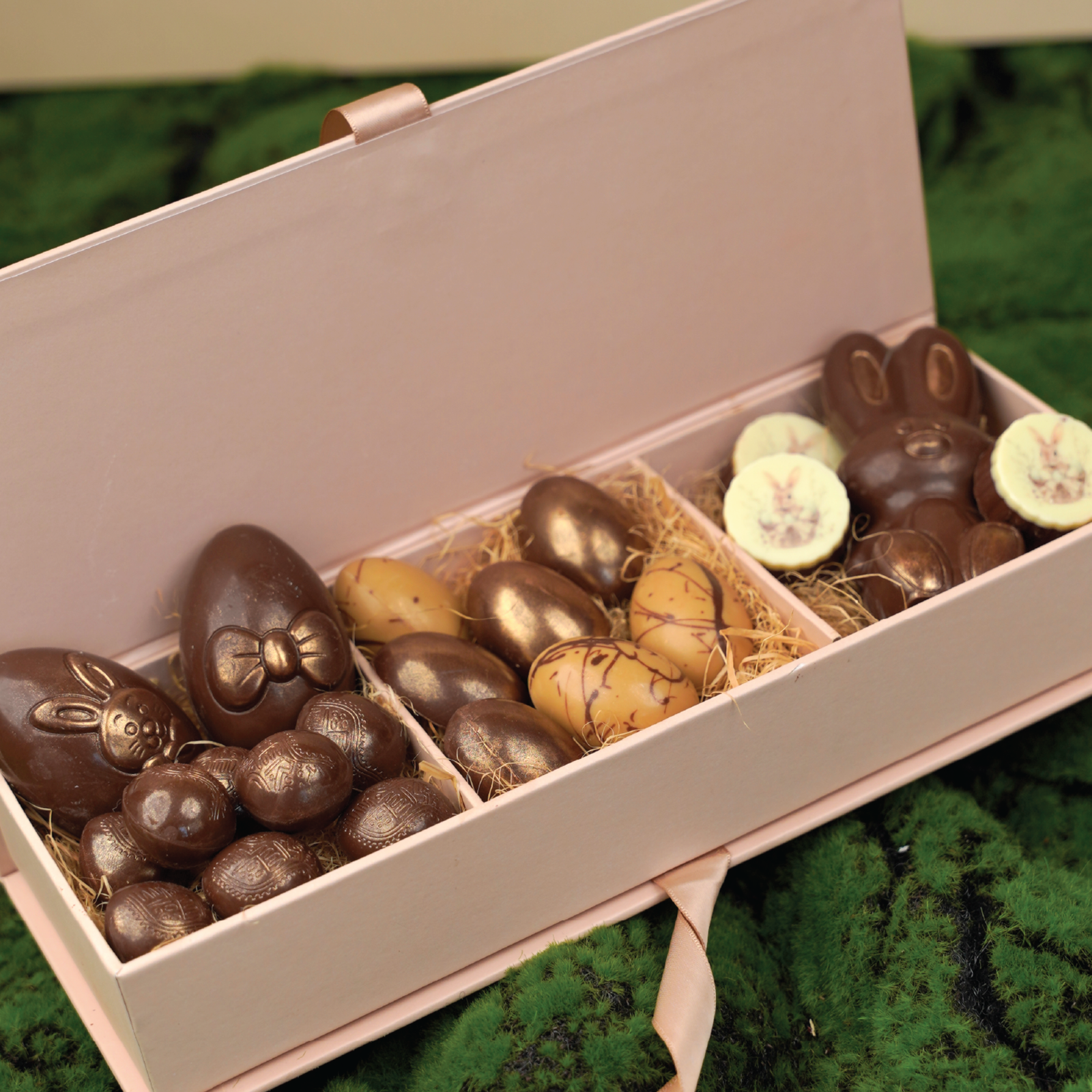 The Signature Easter Ribbon Box is presented in a soft pink structured case, finished with a custom ribbon detail that enhances its understated elegance. Inside, approximately 430 grams of premium assorted chocolates are carefully arranged, offering a balanced selection of festive shapes and rich fillings.
